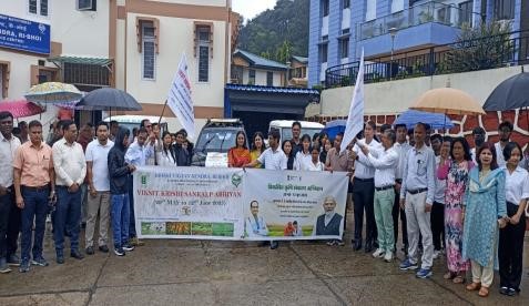 ICAR- Krishi Vigyan Kendra, Ri Bhoi launched and Flag Off for Viksit Krishi Sankalp Abhiyan- Bharat Krishi Jagran Yatra: Anusandhan Kisan Ke Dwar as Pre-Kharif Campaign on 29th May 2025. The campaign launched and Flag Off three Krishi Rath by the Chief Guest Dr. S. Ghatak, Director, ICAR Research Complex for NEH Region, Umiam in presence of more that 100 participants including Dr. N. Okendro Singh, Dean CPGSAS (CAU), Dr. Ram Singh, Dean, CoA, Kyrdemkulai, Dr. S Basanta Singh, Nodal Officer Institute KVKs, Heads of Divisions of ICAR, Dr. Mokidul Islam, Head KVK Ri Bhoi, Shri Pranjal Jyoti Dutta, District Horticulture Officer, Smt Serolyne Chyne, District Agriculture Officer cum PD-ATMA, District Veterinary Officer, Senior District line departments Officers, 30 students from College of Agriculture, Kyrdemkulai, State and District Nodal Officers of VKSA, Scientist from ICAR-ATARI Umiam and ICAR-NBPGR Regional Station, Representative from DDK Shillong etc. The aim of the Abhiyan is to bridge the gap between agricultural research and the farming community by taking the knowledge directly to the fields.The Krishi Rath with 3 teams consisting ICAR Scientist, CAU Faculty,Line department officials,members from FPOs, NGOs and progressive farmer moved from KVK RiBhoi in 3 different routes covering 9 villages I.e. Nongtraw, Umsarang, Lumdiengngan, Bhoirymbong, Thadnongiaw, Sohliya, Nongrim Nongladew, Mawbri and Khweng at 3 points covered 1082 farmers. The Krishi Raths are equipped with PA systems for providing voice messages from Hon’ble PM, Union Minister of Agriculture & Farmers Welfare with agro-advisory informations, printed materials of leaflets/pamphlets, conducting demonstrations on relevant technologies, and creating awareness about different govt. schemes etc among the farming community. The awareness provided to farmers for technologies like Soil health , Nursery management, Soil and water conservation, Climate resilient technologies, Natural farming, Mushroom production, Composite fish culture, Off-season vegetable cultivation, Vermicomposting, Integrated Farming System, Resource Conservation Technologies, Animal feed/health management, Seedling root-dipping in SSP-CAU Bio-enhancer amended slurry method for transplanted rice and vegetables, CAU-Bioenhancer plus Um-Comb application of organic rice cultivation etc for the enhancement of yield and income of farmers.