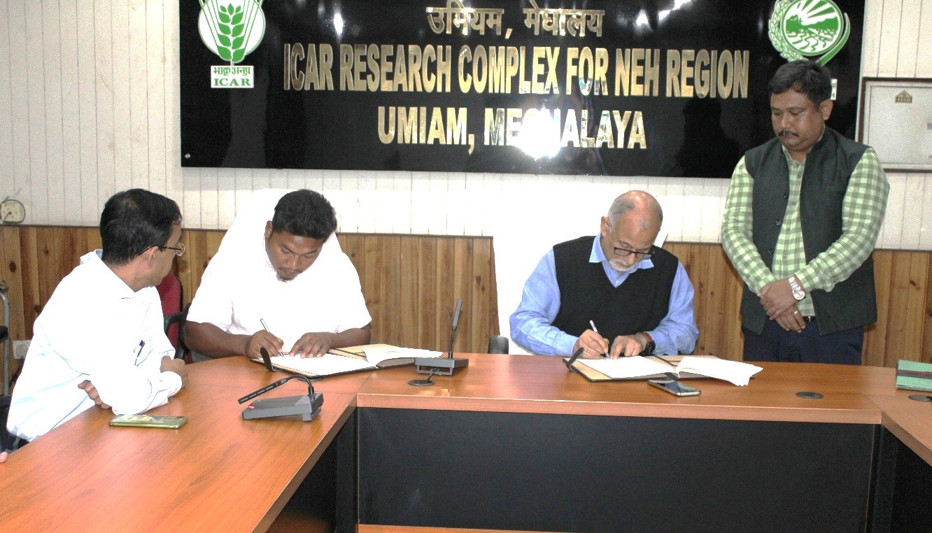 ICAR Research Complex for NEH Region, Umiam, Meghalaya signed Memorandum of Understanding (MoU) with the Dorbar of Nongspung -A Village, Ri Bhoi District, Meghalaya on 11th November, 2025 to develop a poultry cluster village. The MoU was signed between Dr S. Hazarika, Director of the institute and Mr George A Marak, Headman, Nongspung-A village. The ceremony was attended by Dr Sandeep Ghatak, Head, DAFS, Dr Pankaj Baiswar, Head, DCS and In-Charge, PME, Dr Sourabh Deori, Senior Scientist, Dr G. Khargharia, CTO and representatives of Nongspung-A village.