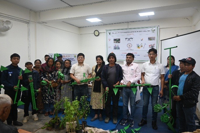 Dr. Hijam Jiten Singh, Scientist (Agricultural Engineering), DSRE and technical staff viz., Mr Aftab Hussain, who showcased region-specific implements designed to reduce drudgery and improve operational efficiency in hill agriculture.